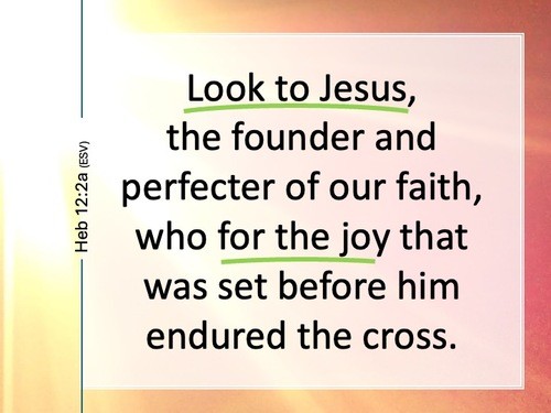 Heb 12:1-2 calls us to look to Jesus to see how we are to run with endurance the race of following Christ. Heb 12:2 says we are to look to "to Jesus, the founder and perfector of our faith, who for the joy that was set before him endured the cross." The key to understanding how to endure in our walk with Christ is looking to see how our Lord lived out His life. And what the writer of Hebrews tells us is that our Lord set his gaze, his focus, beyond the deepest, most tremendous suffering he was to endure: the suffering of the cross.