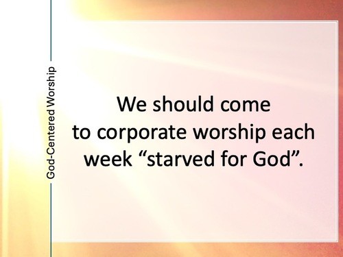 (1) "The true diagnosis of weak worship is not that we are coming to get and to give." Rather, "people ought to come to corporate worship services to get." But here is the key: it is what people come to get that matters. We ought to come "starved for God." That is, we should come to corporate worship to get God. (Psa 42:1)