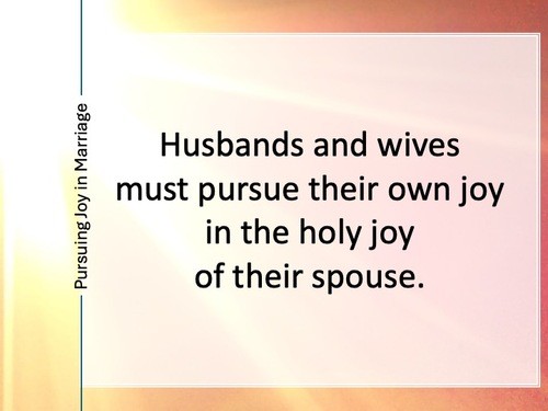 So for our marriages the gospel should be on full display as we seek our joy not apart from our spouse but in the holy joy of our spouse. Even our "sacrifices" become acts of joy for us.